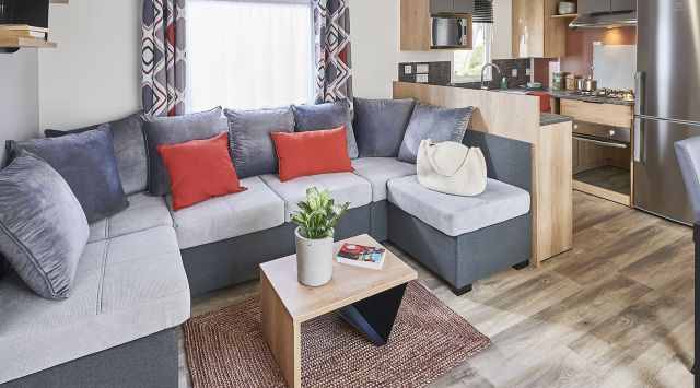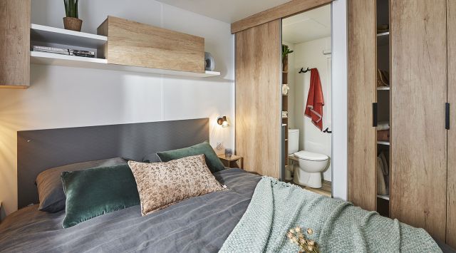 - Equipements de série : bardage greenwood, réfrigérateur, four, volets roulants chambres, lit sur vérin, canapé résidentiel convertible, convecteurs toutes pièces, hotte