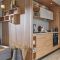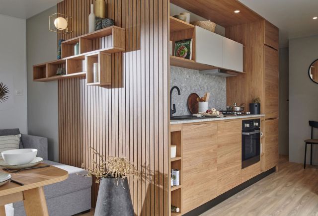 • Table de cuisson 4 feux gaz inox • Hotte avec éclairage intégré • Réfrigérateur congélateur intégrable • Micro-ondes encastrable • Four encastrable • Lave-vaisselle encastrable • Evier en céramique et mitigeur noir • Détecteur de fumée • Range couverts • Prises électriques • Volets roulants • VMC