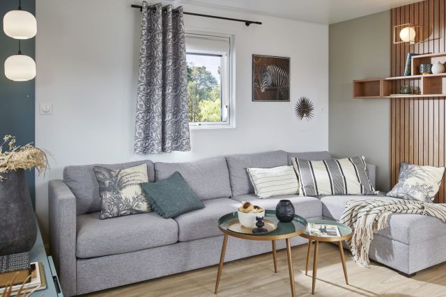• Canapé avec convertible • Meuble TV séjour dans le Mistral, Marin et Ponant • Support TV séjour dans le Levant • Table basse • Table repas avec rallonge • Chaises et chaises pliantes • Etagères • Rideau occultant • Volets roulants • Applique murale • Suspensions • Spots led plafond avec variateur de lumière • Convecteur 1000W • Attente climatisation
