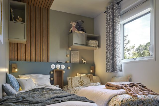Le séjour bordé de grandes baies vitrées offre une sublime luminosité et donne le sentiment d’un lieu très aéré et spacieux. La cuisine est ouverte directement sur la terrasse ce qui est d’une grande praticité et induit une grande simplicité au quotidien. Les deux espaces « nuit » sont séparés de l’espace de vie de façon nette pour garantir un meilleur confort. Les espaces de rangement ne viennent pas à manquer dans ce mobil-home résidentiel Louisiane, comme entre autres le magnifique dressing dont est dotée la suite parentale.