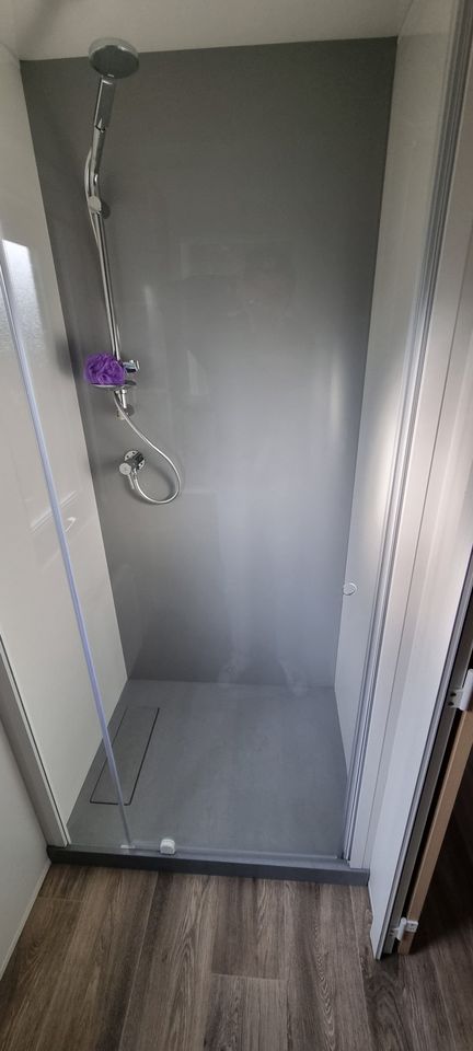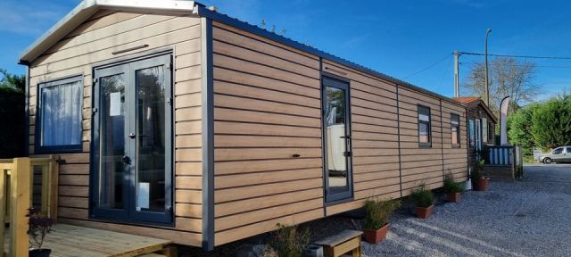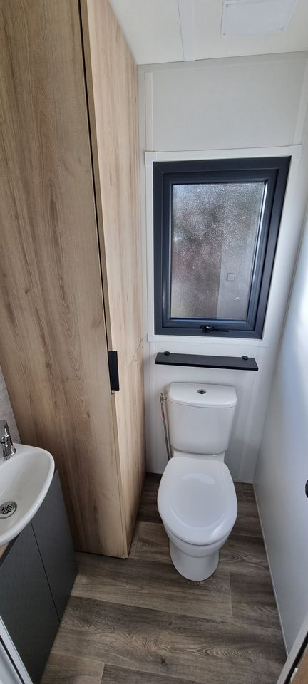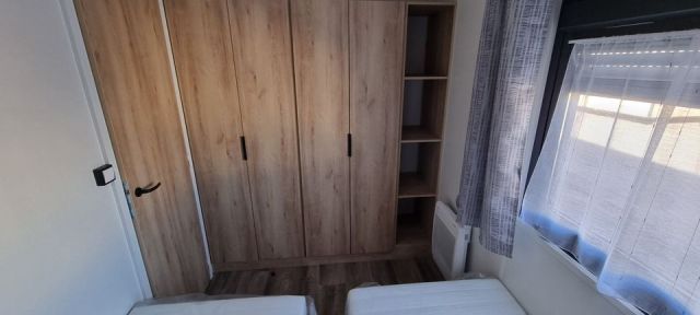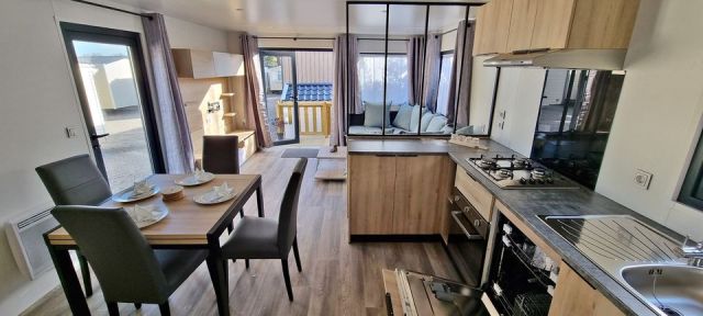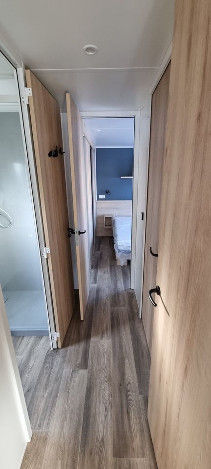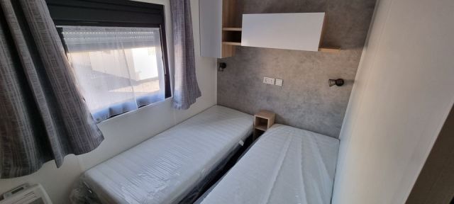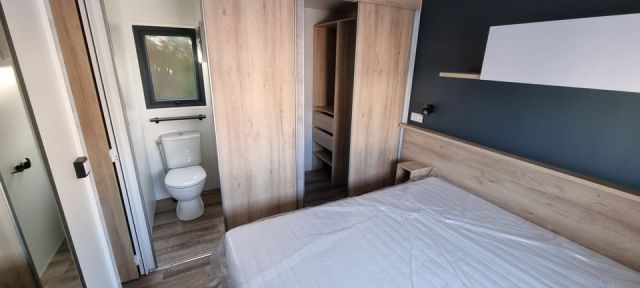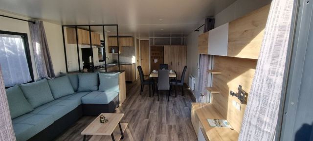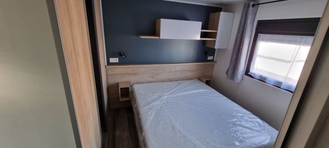 - Equipements de série : bardage shadow, four, lit sur vérin, volets roulants chambres, canapé résidentiel convertible, convecteurs toutes pièces, hotte