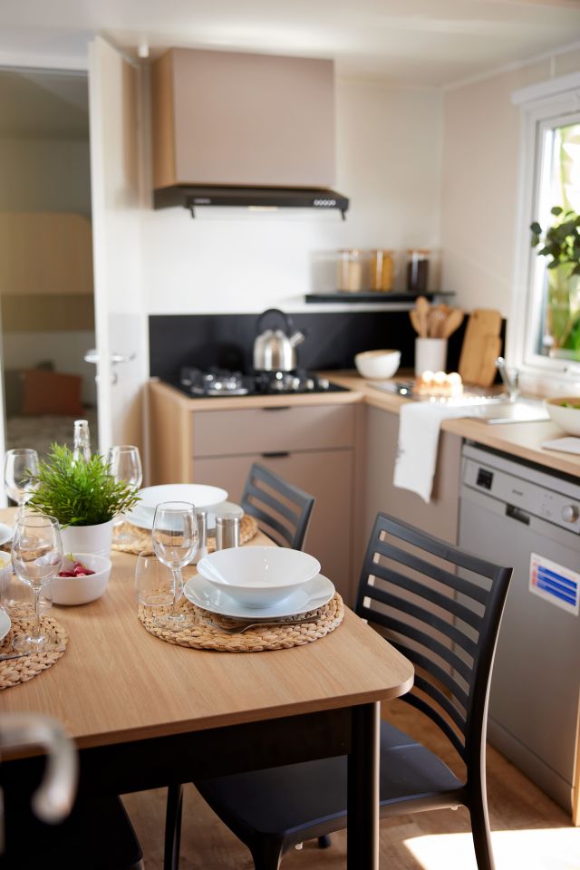 Ce mobil home trigano 3 chambres permet de profiter d’une agréable cuisine toute équipée et de nombreux rangements dans les chambres. Le mobil home NEST 33.3 est le logement rêvé de tous les vacanciers, qu’ils viennent en famille ou entre amis.