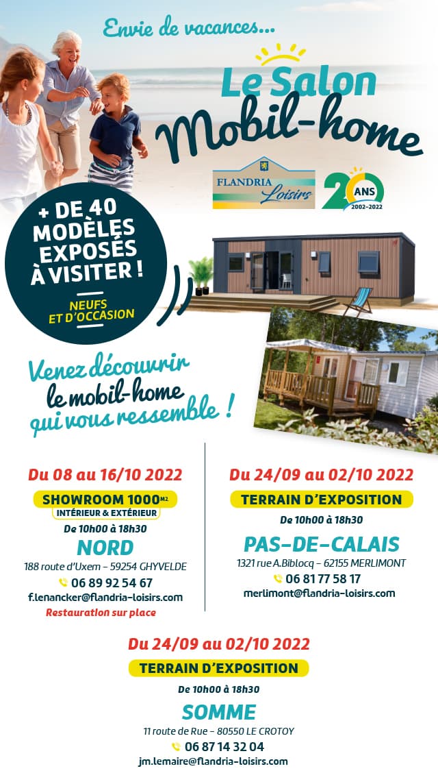 2 temps forts sur le salon du mobil-home c'est plus de 2000m² de showroom avec plus de 40 modèles d'exposés ! Vous trouverez votre résidence secondaire pour partager des moments inoubliables avec vos amis, enfants et petits enfants.